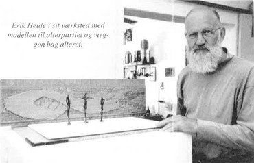 ”Møde med kunstneren bag udsmykningen i Skalborg Kirke. Trods navnet Flade ligger byen på en bakkeskråning på nordvest- siden af Mors. Ud over en lokal Sparekasse, et radiomuseum og en døgner på en lille servicestation har byen ikke længere et aktivt handelsliv. I byens udkant, med sit hvide hus, værksted og have højt placeret på bakken bor byens berømte billedhugger, den 66-årige Erik Heide, der indirekte igennem 31 år har påvirket Skalborg Sogns kirkegængere, idet han er ophavsmanden til udsmykningen i Skalborg Kirke. Erik Heide er oprindelig uddannet som kunstmaler på Kunstakademiet i København men der gik kun meget få år efter endt uddannelse, inden han gik helt over til kun at udtrykke sig som billedhugger. Udstillings- og udsmykningslisten er enorm, og med udsmykning af over 30 kirker over en 40-årig periode, er han en af de nulevende kunstnere, der har sat det største præg på udsmykningen af såvel nye som gamle kirker – og stadig gør. At det ville gå sådan, da Skalborg Kirkes første menighedsråd valgte Heide som kunstner, var jo ikke til at vide, da det først var hans tredje store kirkeudsmykningsopgave. Han betegner det da også som et modigt valg, idet menighedsrådet traf sin beslutning på et udkast bestående af tre små ”tændstikmænd”.